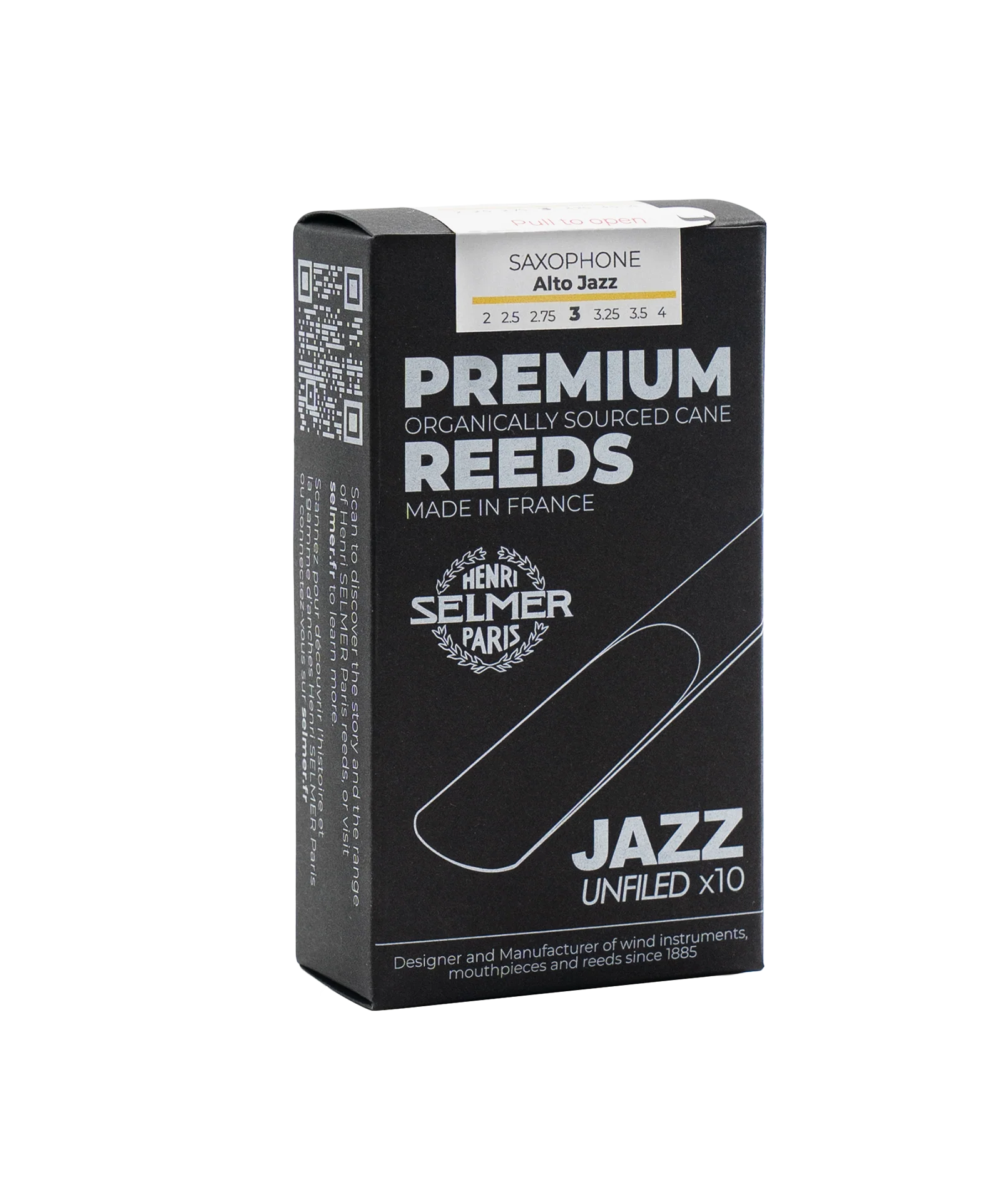 As palhetas Henri SELMER Paris são meticulosamente calibradas em incrementos de um quarto da força, entre 2,5 e 3,5, para reduzir a variação e, assim, oferecer aos músicos um maior número de palhetas de qualidade em uma única caixa.