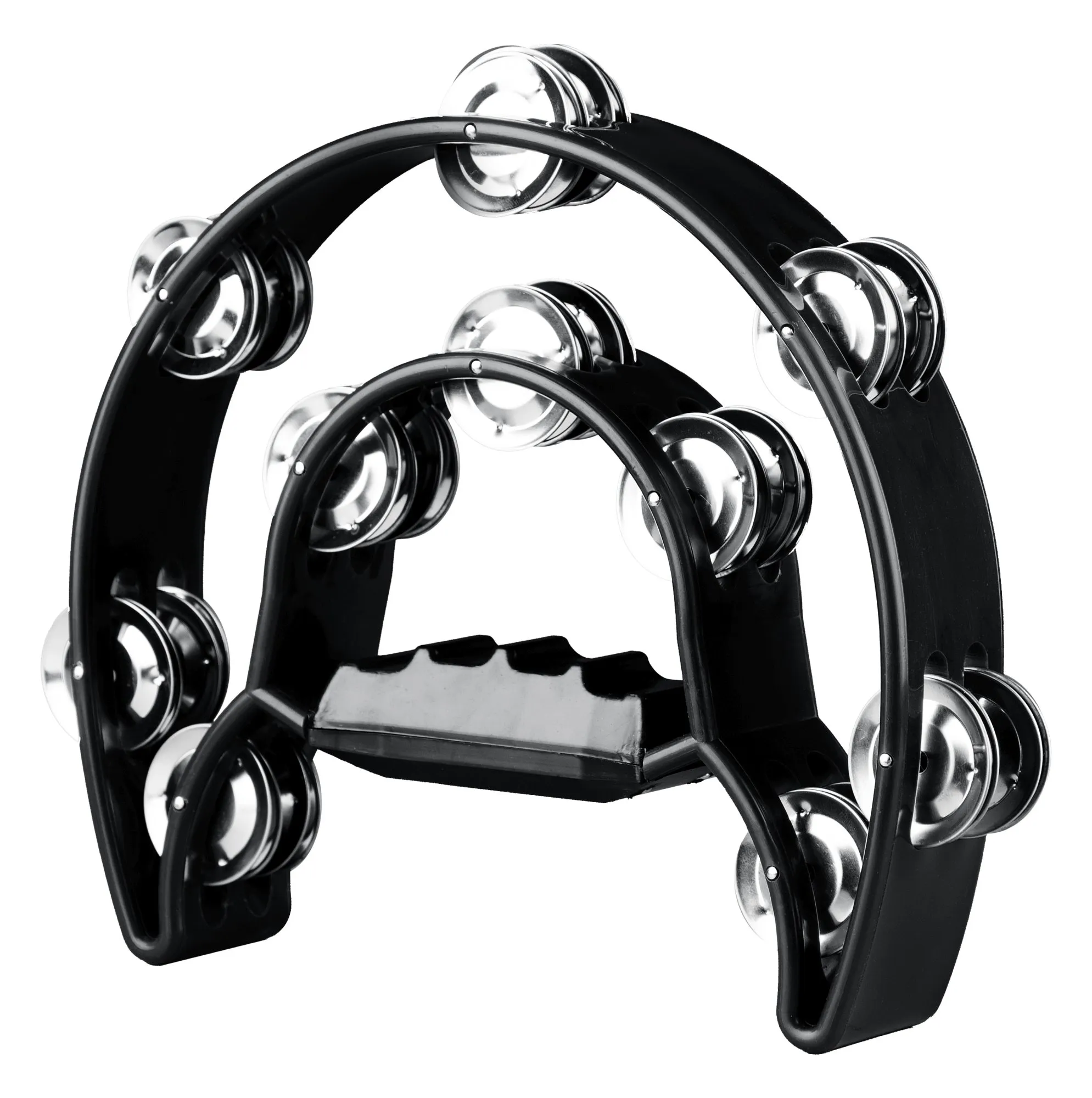 A pandeirola meia-lua é um instrumento de percussão ergonômico, em formato semicircular, com corpo de plástico resistente (ABS/policarbonato) e platinelas de inox, ideal para ritmos como samba, pagode e pop.